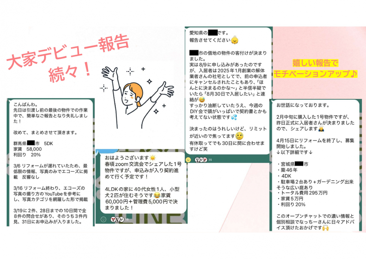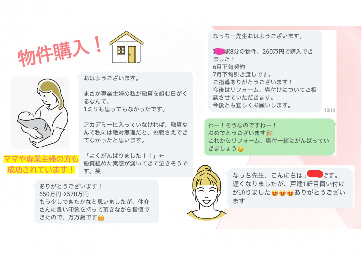 戸建て投資アカデミー パート主婦大家なっちーこと舛添菜穂子主催の不動産投資スクール。 当スクールには二つのアカデミーがあります。 戸建て投資アカデミー® 別荘民泊アカデミー® 様々な不動産投資手法がある中で このアカデミーでは戸建て投資/別荘民泊を学んでいきます。 実践的だからこそ身になる。 専門家から聞くことで、本格的で使えるものを学ぶ。 皆さまの 輝ける未来を 目指して 【生徒様限定コンテンツ】 ログインすると、【戸建て投資】【別荘民泊】それぞれ受講しているアカデミーのコンテンツが表示されます。 生徒様は画面右上のログインからログインをお願いいたします。 ミニセミナー開催お知らせ登録 アカデミーの活動風景 生徒さんの声 上に戻る |